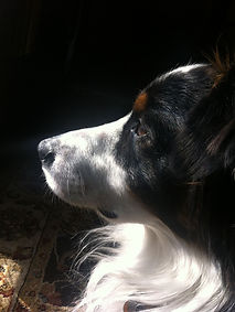 Blaze, the black tri, is quiet and the typical loyal Aussie. Sits and watches us train the horses and hardly leaves our sight. Loves to play ball and wrestle with Gus.